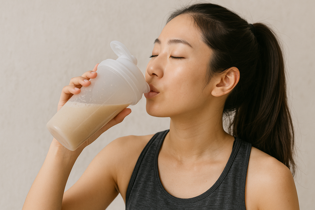 シェイカー1杯・10秒で20g前後のたんぱく質が補給できる。