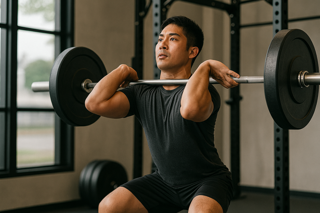 バーベルを床 → 一気に首元へ引き上げてキャッチ。