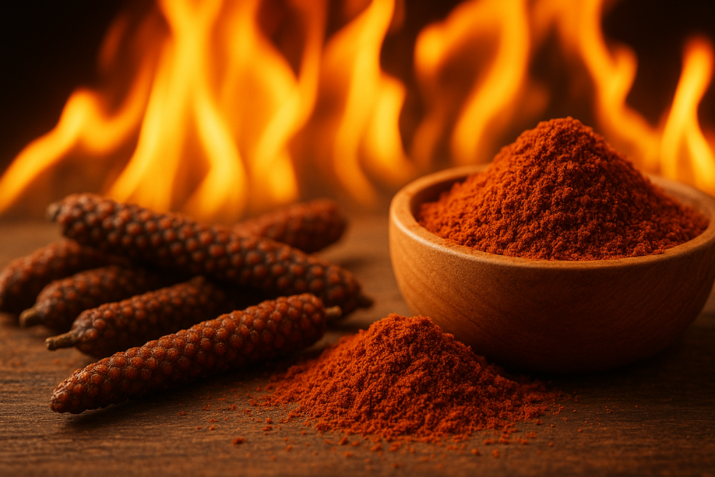 ヒハツは、黒胡椒のような香りとスパイシーな刺激を持ちつつも、どこか甘い後味があります。