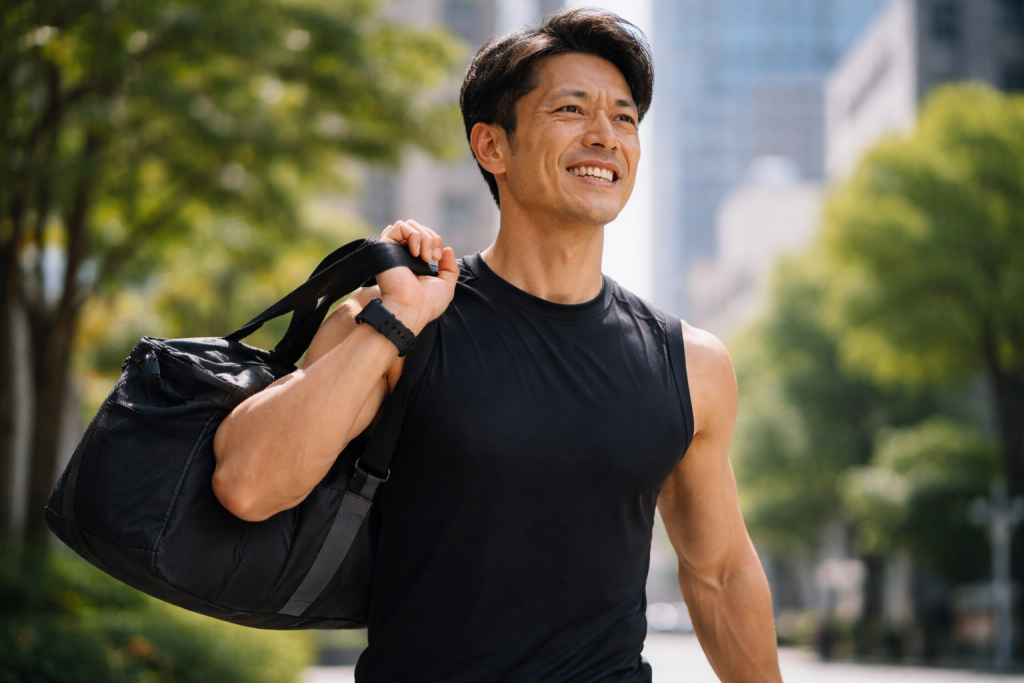 コツコツ筋トレを続けた結果、気づけば体型はストレート寄りに。